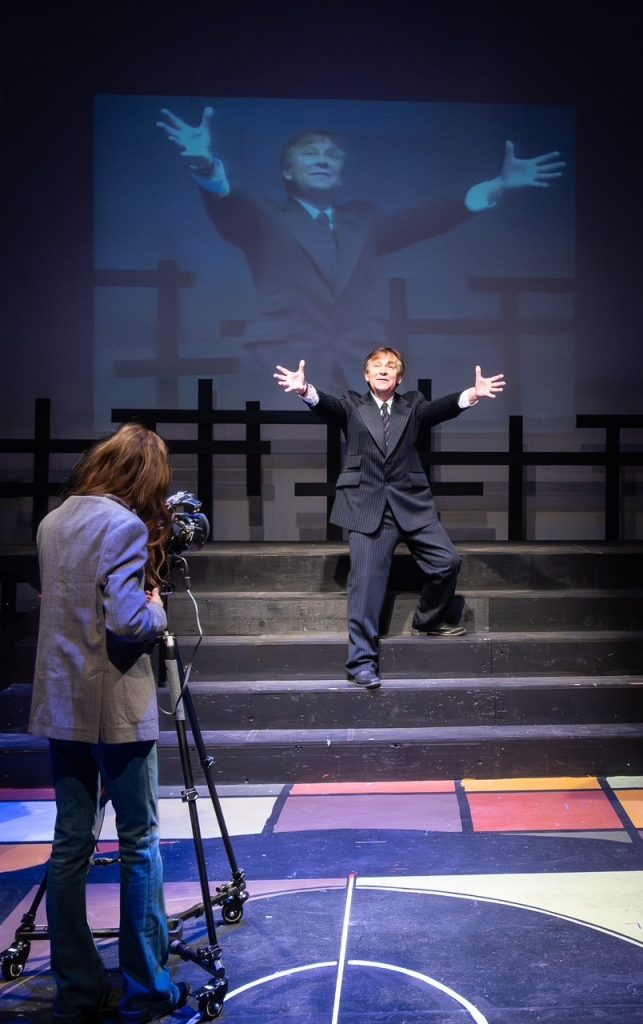 Marr, as Beale, the UBS TV evening news anchor – “a childless widower with an alcohol problem” – sits at the news desk while behind him is projected a huge image of what the cameras are capturing for their viewing audience. The level of authenticity this small theatre company achieves is remarkable.